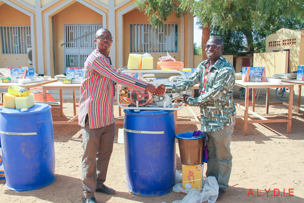 L’appui s’est également étendu aux métiers de services et de commerce. Quatre (04) jeunes ont été dotés de grandes pompes de lavage, de barriques et d’éponges pour le lavage auto-moto.
